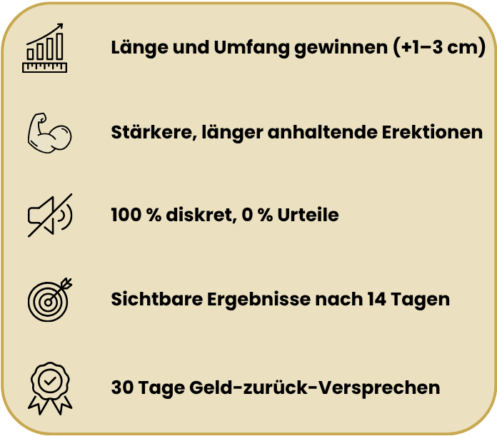 Ich hätte nie gedacht, dass so etwas ohne Medikamente funktioniert. Nach 2 Wochen täglicher Anwendung (10 Minuten) konnte ich eine Zunahme von etwa +1,3 cm feststellen, und meine Erektionen sind deutlich fester. Meine Partnerin sagte sogar: „Du bist selbstbewusster, präsenter.“ Zum ersten Mal hält ein Produkt wirklich, was es verspricht.